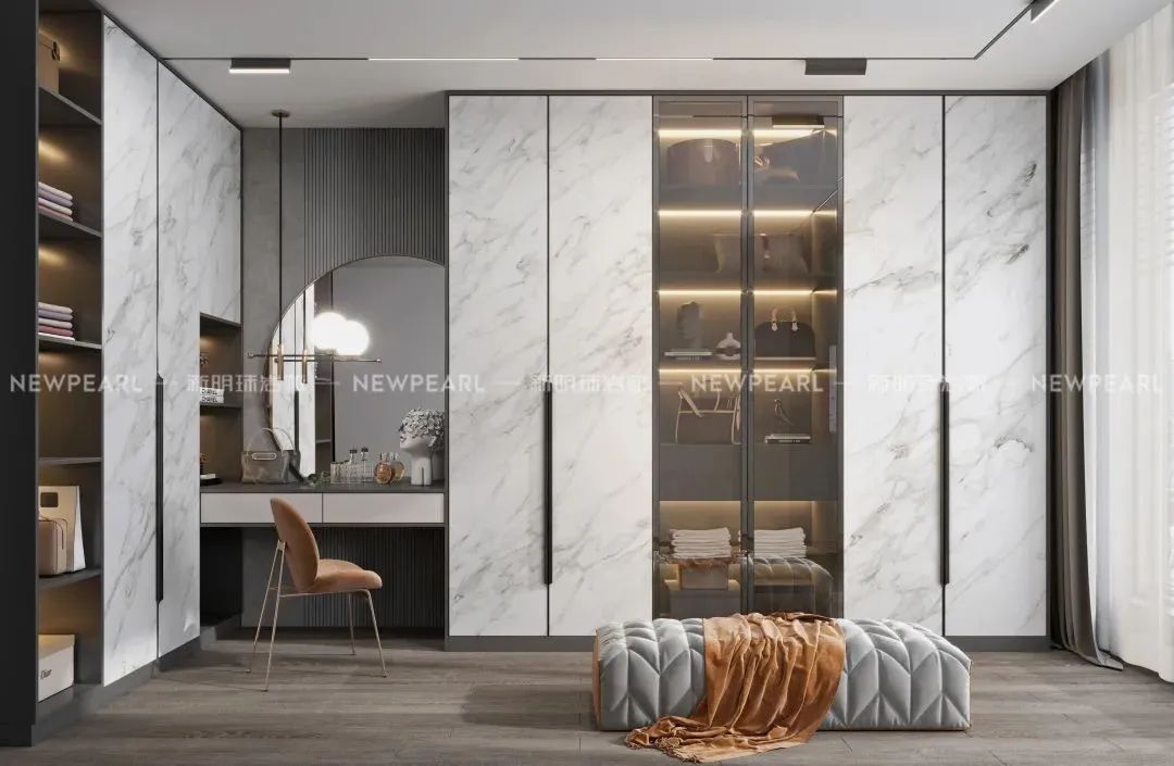 3.5mm纖薄巖板摒棄了傳統(tǒng)石材的笨重感,相對(duì)傳統(tǒng)的瓷磚類產(chǎn)品,反而更像墻漆、墻紙一類材料。較之6mm的巖板產(chǎn)品,更適合用作家具飾面(衣柜、櫥柜)、大宗電器飾面(冰箱)以及工藝品飾面(屏風(fēng)、精加工飾品)。