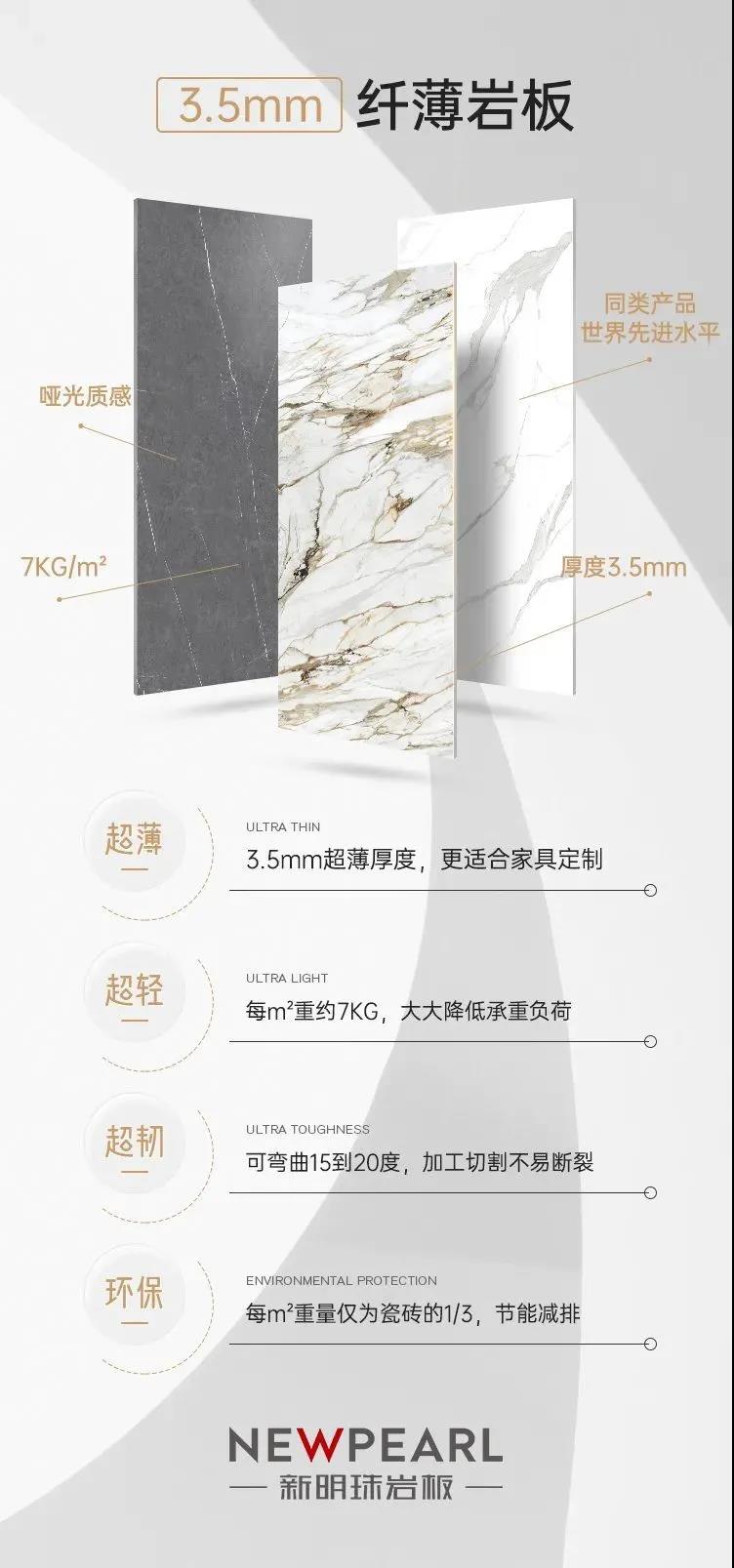 新明珠巖板,具有超薄、超輕、超韌、環(huán)保4大特點(diǎn)。